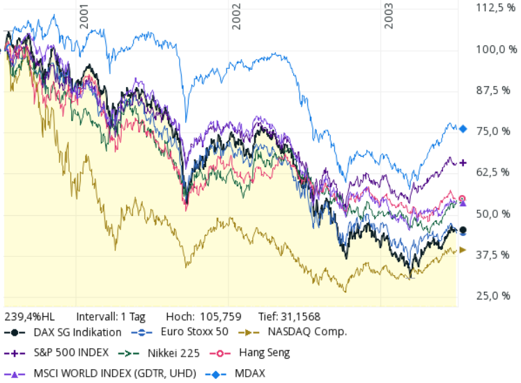 Denn im Zweifel laufen die weltweiten Aktienmärkte alle im Gleichschritt: Entweder rauf – wie seit 2008, in erster Linie getragen durch das Gelddrucken der Zentralbanken – oder runter – wie eben damals – Grafik vom 01.01.2000 bis 01.07.2003 – minus 50 % oder mehr in nahezu allen Märkten weltweit: