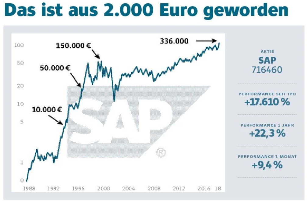 In der Sparkasse ging damals der Effecten-Spiegel um, ein zu dieser Zeit recht neues Anleger-Magazin, an dessen Titelseite ich mich gerade in einem speziellen Falle sehr gut erinnern kann – als die SAP-Aktie 1988 an die Börse ging. Der Effecten-Spiegel warnte damals eindringlich vor dem Kauf – die Aktie sei mit 750 DM viel zu teuer!
