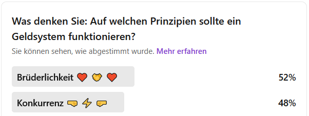 Hier das Zwischenergebnis meiner Umfrage zum Geldsystem von letzter Woche: