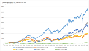 Michael stellte damals seine “Minimum-Varianz-Strategie” vor. Eine Anlagestrategie, die er bereits im Jahr 1991 (!!!) entwickelt hat. Das hier ist die Wertentwicklung in diesen letzten 30 Jahren im Vergleich mit verschiedenen Aktienindices: