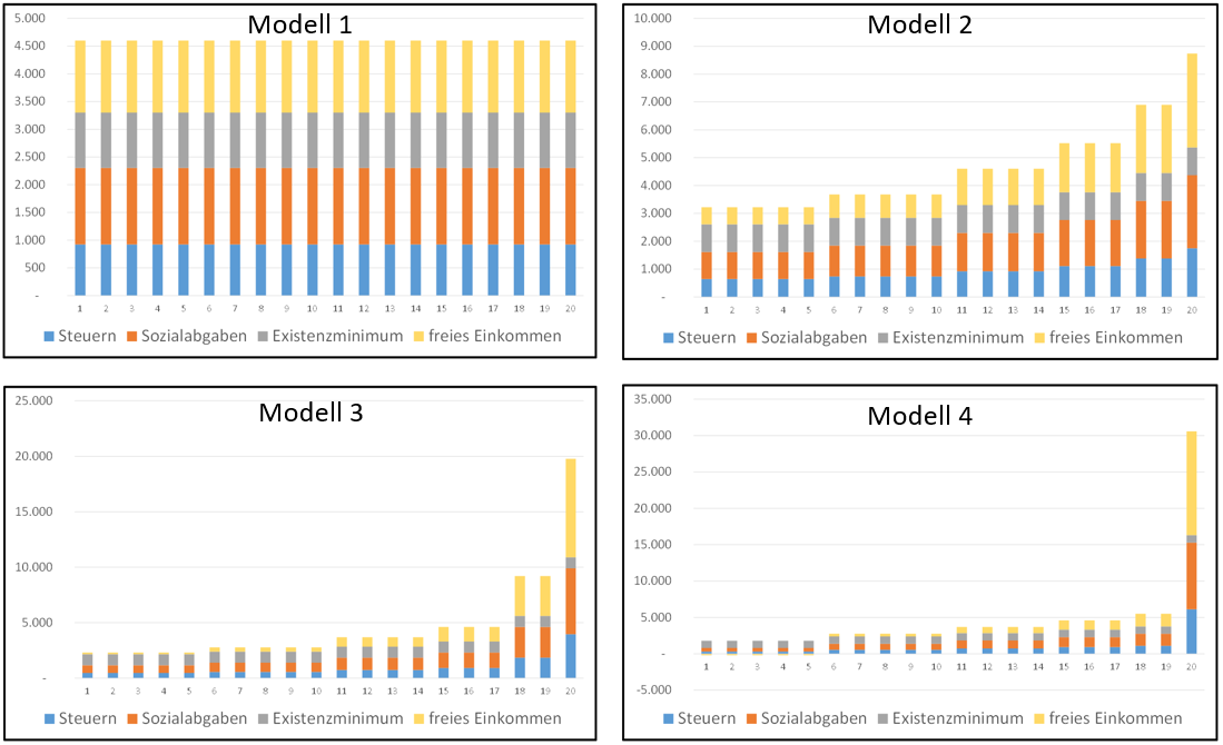 Dazu habe ich die Durchschnittszahlen aus Deutschland genommen und diese nach vier unterschiedlichen Modellen auf eine Mustergesellschaft von 20 Menschen verteilt.